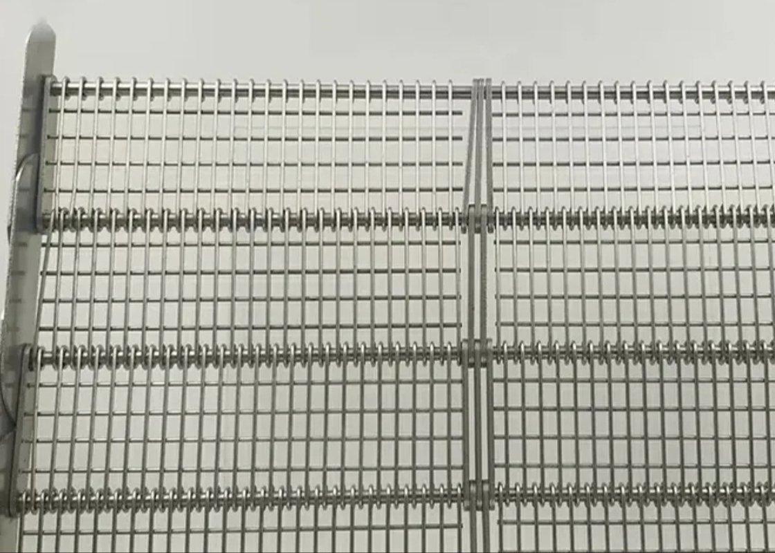 El cinturón de malla de alambre de enlace de ojo está construido por anillos de alambre formados en forma de "ojo", fijados por alambre soldado por debajo, manga o resorte con varillas cruzadas.Este diseño es ideal para transportar cargas pesadas o productos frágiles que requieren un soporte fuerte.